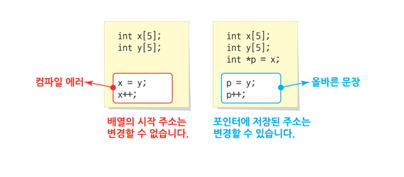 - 배열이 메모리에 할당되고 나면, 배열의 시작 주소를 변경할 수 없다.