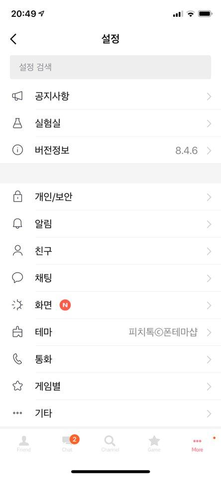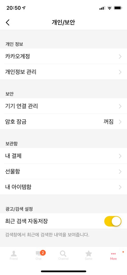 아마 안드로이드 OS 에서도 큰 차이 없을 것 같지만, 카카오톡의 더보기 화면에서, '개인/보안' 탭으로 이동합니다.