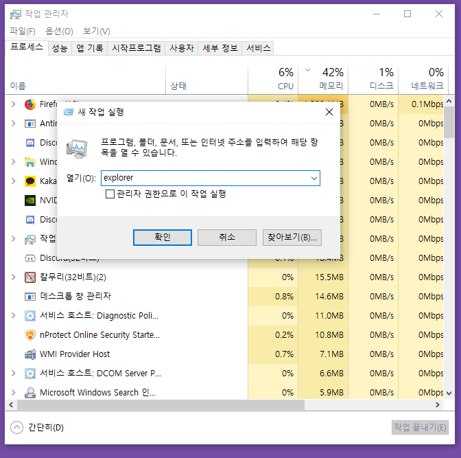새 작업 실행 란에 explorer 이라고 적고, 확인을 눌러줍니다.