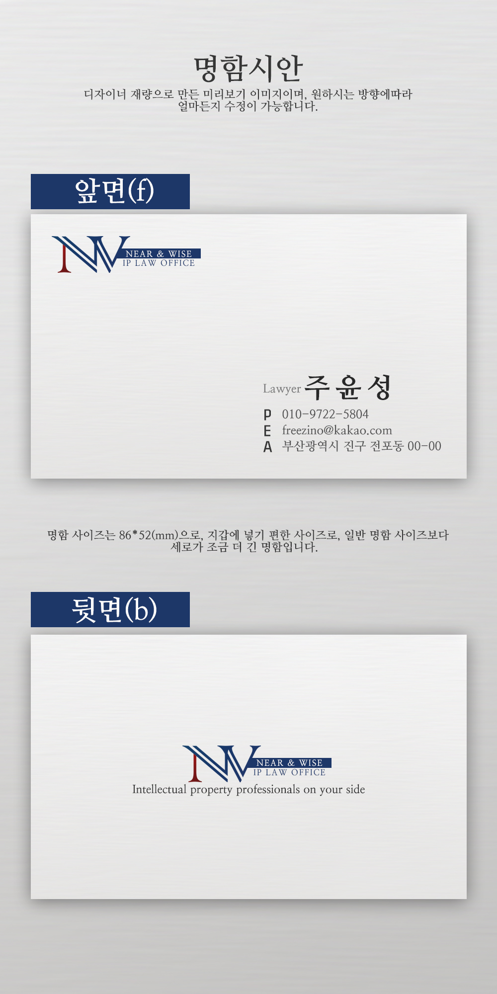 법률서비스에 포커스를 맞춘 깔끔한 적/청 색상과, 카드명함 사이즈를 고려하여 만든 시안입니다.