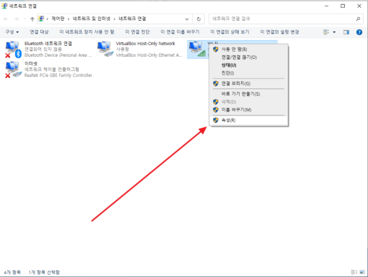 - IP를 설정할 네트워크 어댑터를 선택하고, 마우스를 우클릭 해주세요.