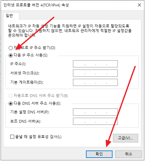 - [다음 IP 주소 사용]을 선택한 다음 IP 정보를 입력합니다.