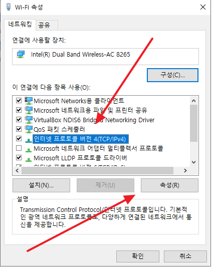 - [인터넷 프로토콜 버전 4(TCP/IPv4)를 선택하고 [속성]을 클릭.