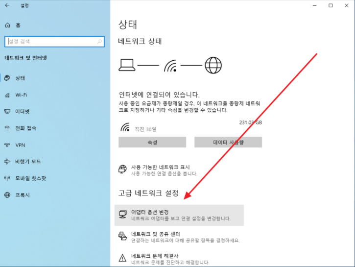 - [어댑터 옵션 변경]을 클릭해주세요.
